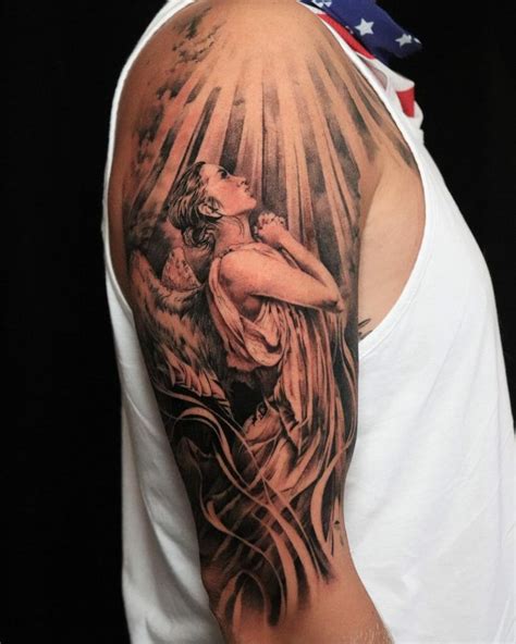 Another meaning associated with angel wings tattoo designs is of rebirth and reincarnation. Place on arms, back neck or other body part you want to. The praying hands position of the angel and the look in its eyes insure the man always has a loved one looking out. Between the serenity of a praying angel and the angst of the.