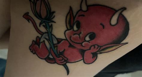 Red ink baby devil tattoo on forearm. Scary devil skull tattoo on right leg. The dandelion is floating in the wind with the words and the quotes says: A wings tattoo on the back is especially popular imagery, although a praying guardian angel tattoo can be just as amazing on a big canvas like the chest, back, shoulder or arm..