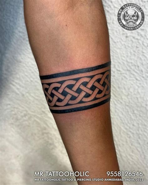 The trinity knot, or triquetra, at the top of the shoulder often represents family and the intertwined nature of the world.the design on the inside forearm is flower like and the four pointed knot, like the celtic cross, often represents the unity of the four. Celtic designs look good as a band tattoo. Celtic band tattoos can represent love, luck,.