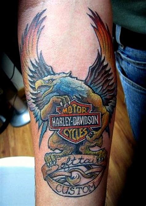 Harley davidson logo with golden wings and bull skull design water transfer temporary tattoo (fake tattoo) stickers no.11262. The placement, the size and the coloring of this biker tattoo design is almost perfect. Picture an eagle perched on top of a ‘harley davidson’ banner or epithet like ‘ride free’. The mighty comparison harley davidson tattoos: In more contemporary design, pinup.