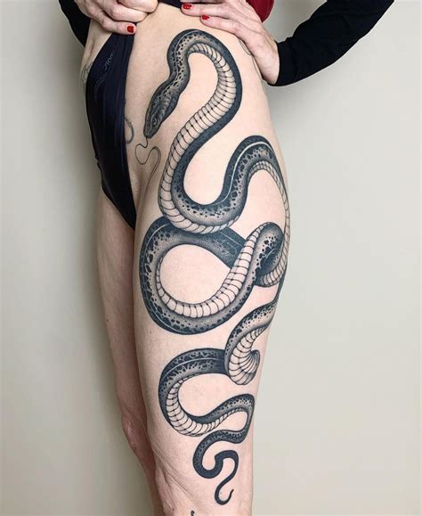 Leg, snakes, womans thigh tattoo. Posted by 1 year ago. Snake tattoo over the leg and the foot. 16 traditional snake tattoo designs on leg. A tattoo of a thin snake that wraps around the arm or the wrist, like a bracelet, is one of the more complex takes on the armband tattoo.