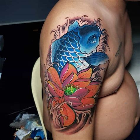 This method of tattooing takes far longer than using a tattoo machine, but the colors come out brighter and the healing process is faster. Koi fish tattoos often represent victory despite struggles. Koi tattoo designs are often combined with splashing water, cherry blossom and lotus flowers.