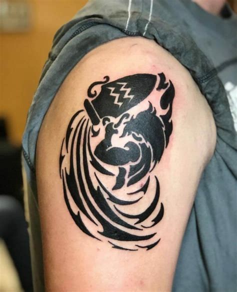 Not to forget, the style and ink color is fairly important too. [see] chopper tattoo | water bearer tattoo designs. This figure often signifies mystical healing. Tribal sun with water waves tattoo on upper shoulder. The most popular aquarius symbol is a water bearer;
