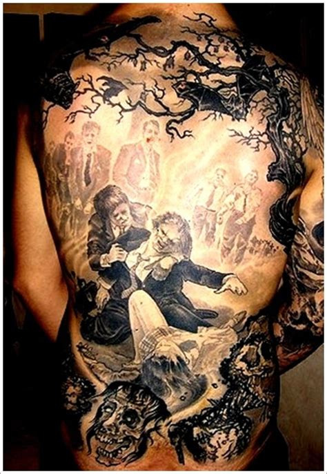 Horror tattoo ideas for gentlemen. It is a beautiful image that shows the level of creativity in modern day body art. You can do the skull design in black ink and a scarier way, while the rose can add that special touch to the tattoo and make it more prominent. The zombie dinos are here! Dec 06, 2019 · 9.